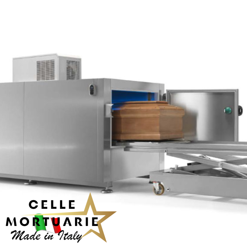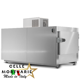 La cella poggia su una struttura in tubolare di acciaio Inox AISI304, completa di nr. 6 piedini antivibranti, diametro 140 mm, regolabili in altezza (130/180 H mm) per permettere il passaggio delle tubazioni di scarico.
